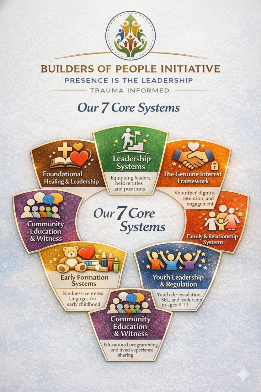Builders of People Initiative operates a trauma-informed systems library supporting youth, families, volunteers, and leaders across multiple environments — designed to scale with dignity and remain effective over time.